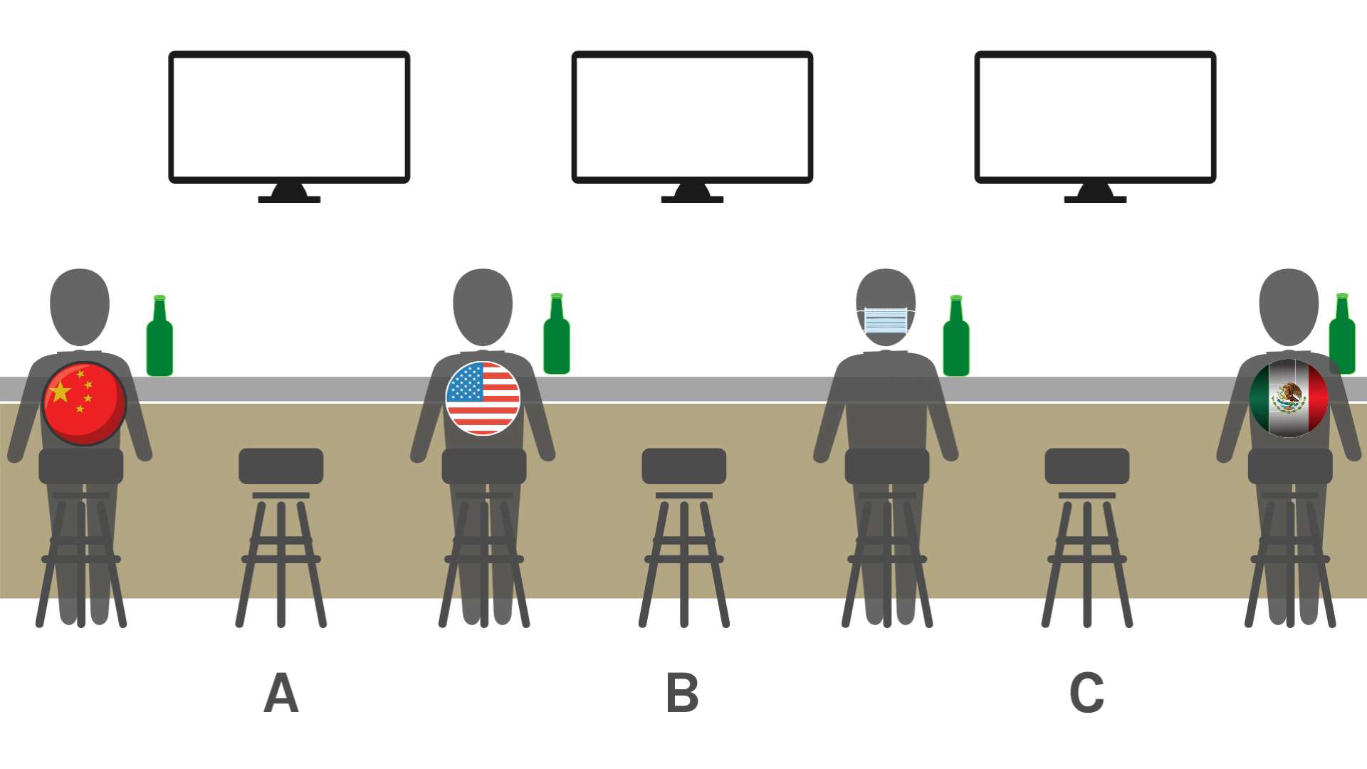 This study was designed as an experimental quantitative study, comparing results from four independent studies, 26 surveys per study (104 total surveys), and a minimum of 50 participants per survey (n = 5,455). Included atop of the questionnaire was a picture of four people sitting on barstools with their backs facing the participant (figure 1), and each patron at the bar was separated by an empty barstool (a total of four occupied barstools and three unoccupied stools). Each patron was wearing various combinations of flags for the United States of America (USA), Mexico, and China, with the remaining patron wearing a mask. The participants were presented with the following scenario: