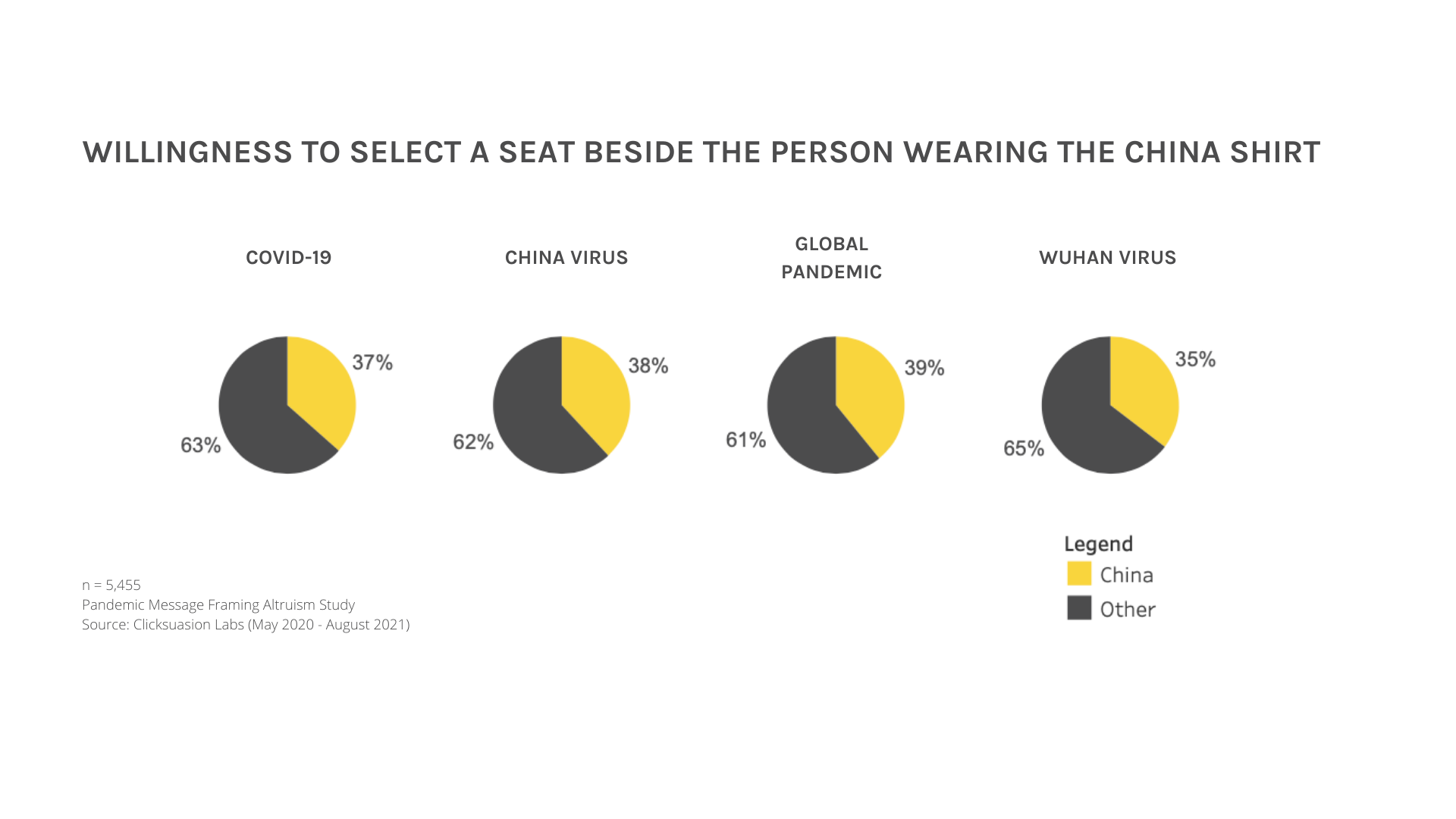 All participants read the same scenario with the exception of the naming convention variable. Study #1’s independent variable was “Global Pandemic”, Study #2’s independent variable was “Wuhan Virus”, Study #3’s independent variable was “China Virus”, and Study #4’s independent variable was “COVID-19”. The survey questions were “Which seat do you prefer?”, “You have enough money for one additional beer. Do you buy a beer for yourself or the person next to you?” (response “yourself”, “person on left”, “person on right”, “I prefer to save my money”), Age (18 – 24, 25 – 34, 35 – 44, 45 – 54, 55 – 64, 65+), postal code, and ethnicity (Native Hawaiian or Other Pacific Islander; American Indian or Alaska Native; Hispanic or Latino; Black or African American; Asian or Asian American; White or Caucasian; another race).